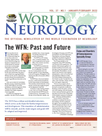 The issue begins with the President's Column, where new WFN President Wolfgang Grisold discusses the past, present, and future of the WFN as well as many activities and goals currently planned under his presidency. This report is also followed by an announcement and photos of all of the new WFN trustees. Dr. Arina Tamborska announces an ongoing survey of neurologic complications of COVID-19 from the University of Liverpool with support from the World Health Organization (WHO) and the World Federation of Neurology (WFN).